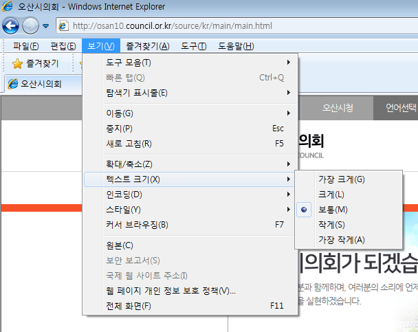 - 1. 인터넷 익스플로러 : 상단 메뉴의 보기 > 텍스트 크기 메뉴에서 설정