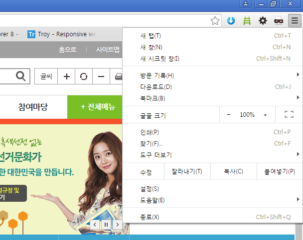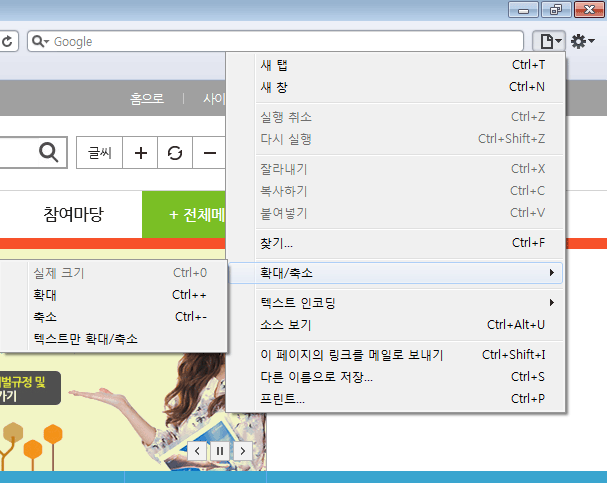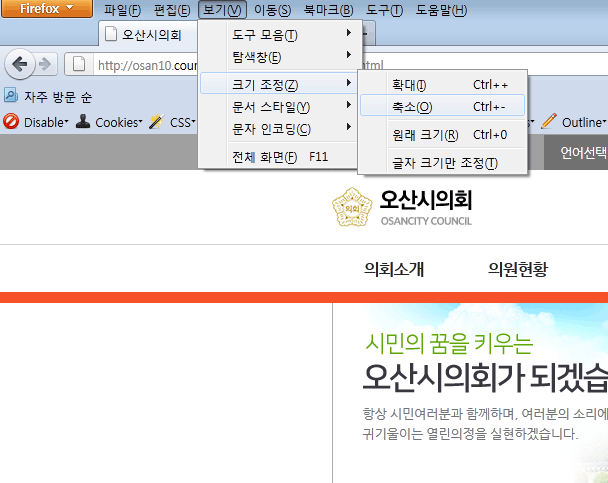 - 2. 파이어폭스 : 상단 메뉴의 보기> 크기조정 메뉴에서 설정