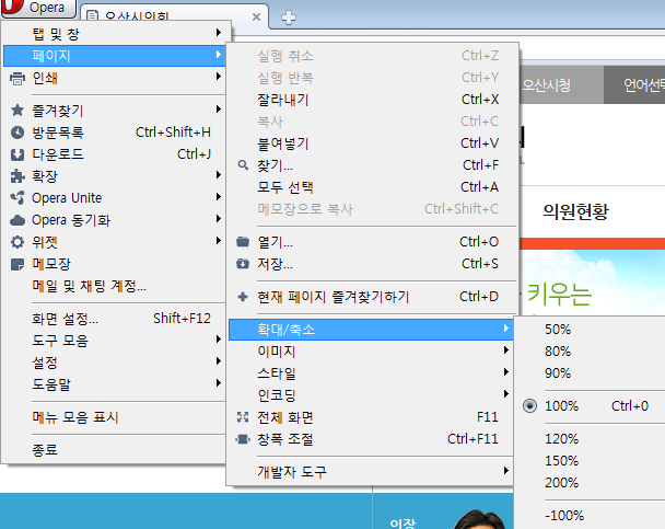 - 3. 오페라 : 왼쪽 상단 오페라 로고 > 페이지 > Zoom 메뉴에서 설정